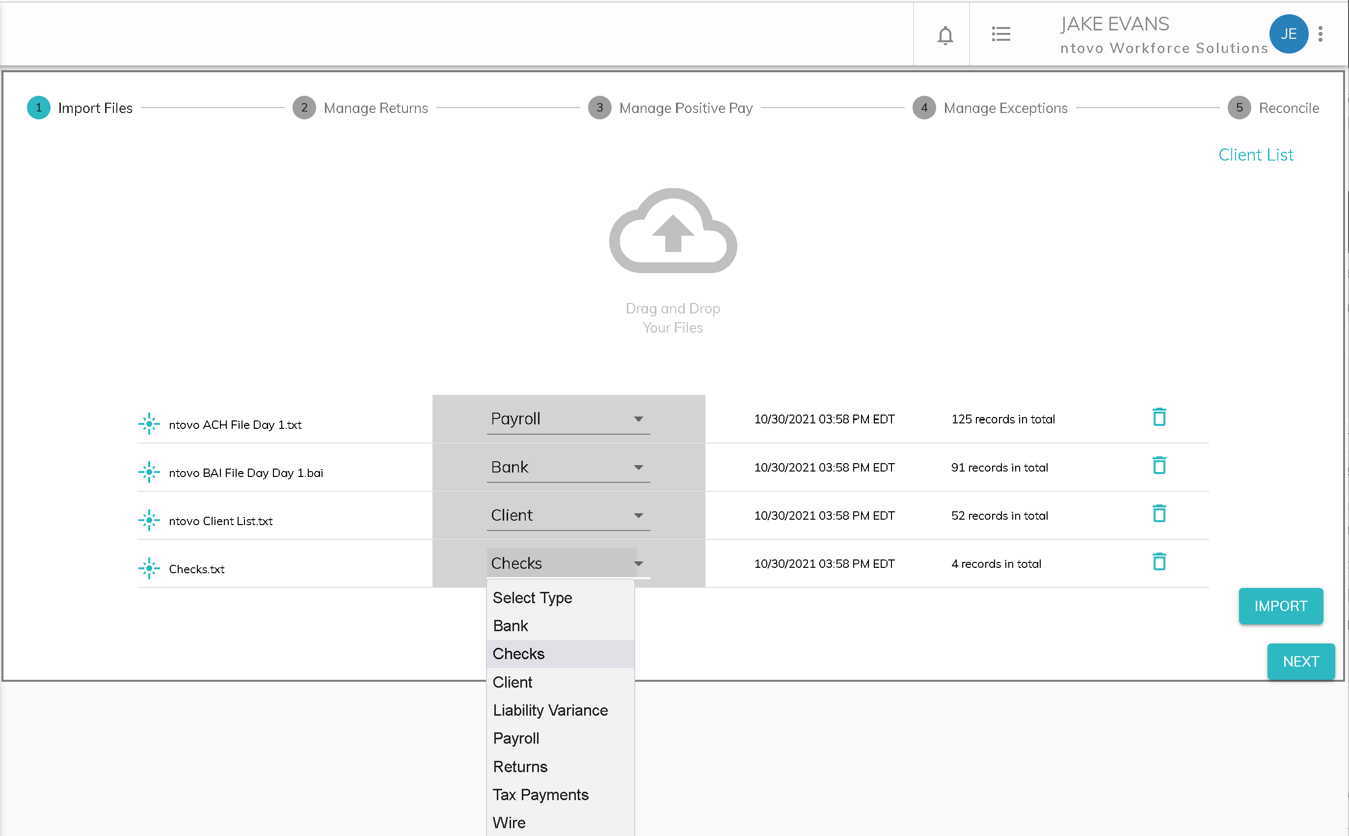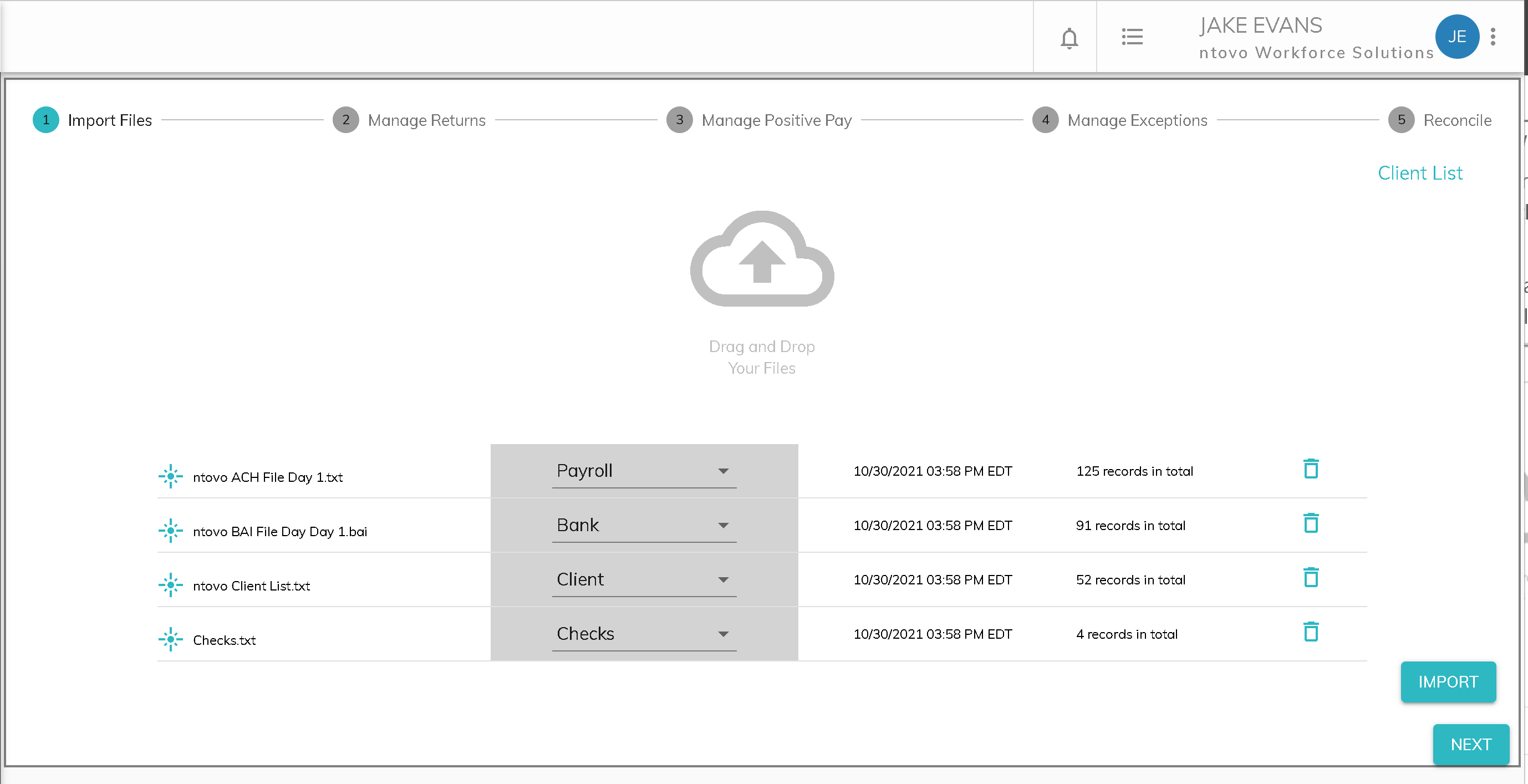- Client files: Client files are used to build and update your client list. Available fields in the client list are Id, Name, FEIN, and Status.