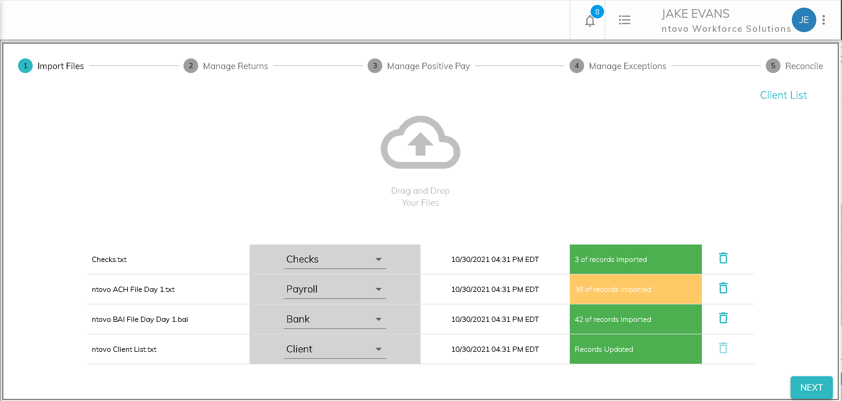 Once you assign file types to all imported files, the import button appears at the bottom right corner of the screen. Once you click the import button, you will see a status bar next to each file. A green bar indicates that the file import was successful and number of records imported will be displayed.