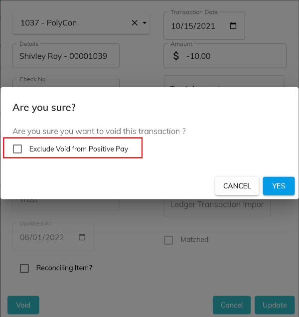 When a check is voided either by importing a checks file containing a voided check or manually voided by a user, unless the "Exclude Void from Positive Pay" box is checked, the voided check is sent to the positive pay screen to be included in the next positive pay file.