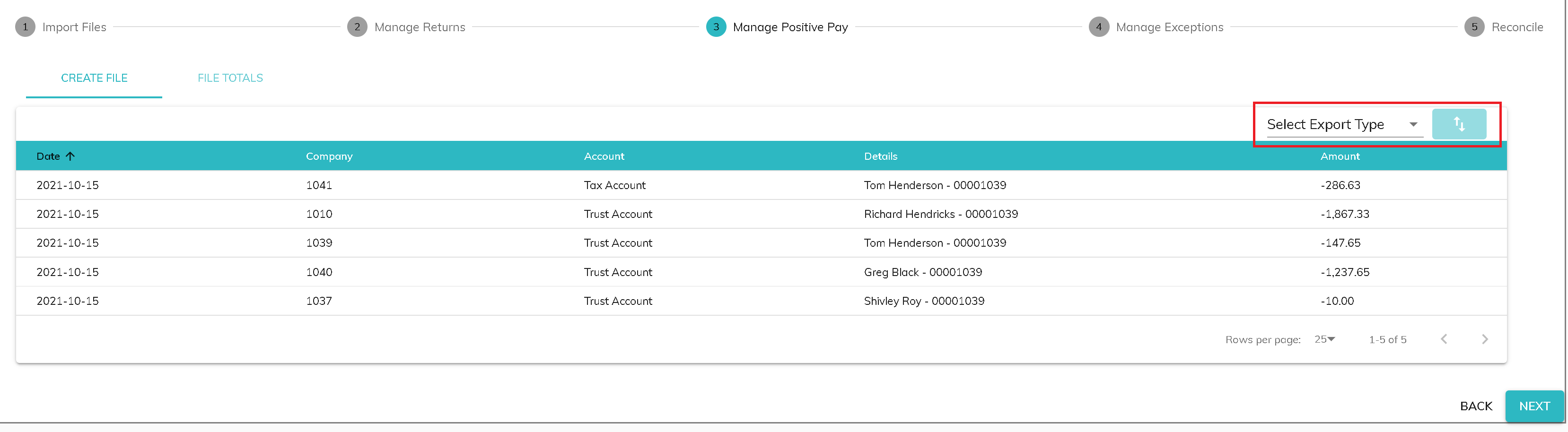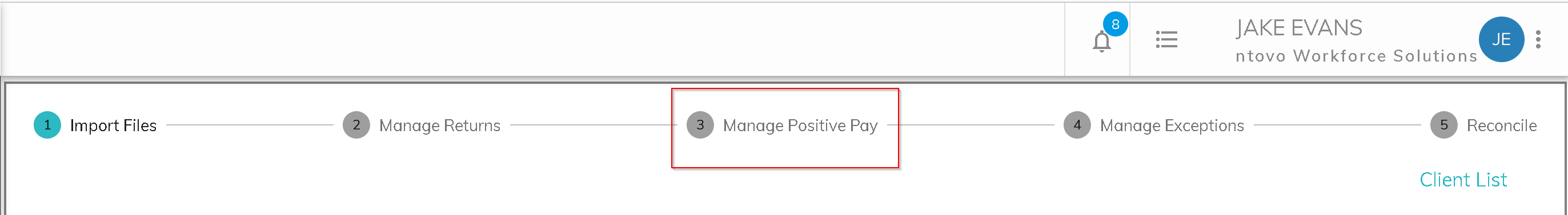 Once configured, the Manage Positive Pay screen will be a new step in your Bank Reconciliation workflow.