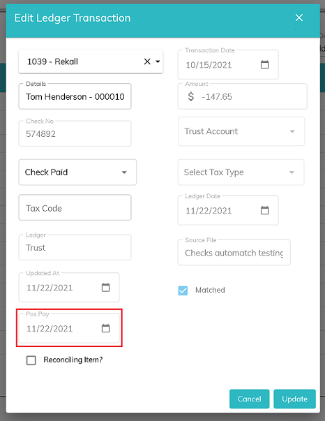 Once a transaction is included in a positive pay file, the date of the file will be populated in the Pos Pay field, which is found on the Edit Ledger Transaction screen of Search Ledger.