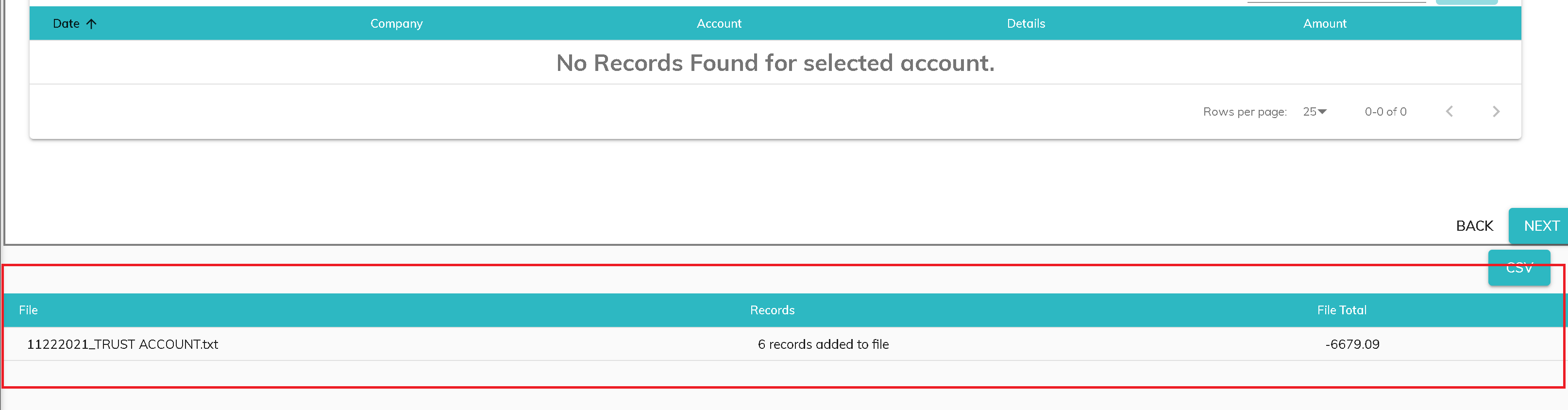 Separate files will create for each bank account in the export type. You will see a message at the bottom of the screen indicating the number of files created, the file name, number of records added, and dollar total of transactions in the file.
