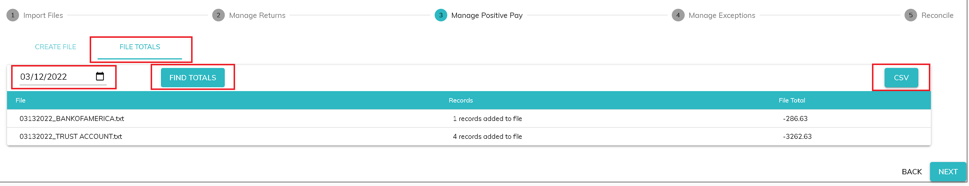 If you would like to see file totals from a prior day, click the File Total tab. Select the prior date and click Find Totals. The information can be downloaded to a csv file.