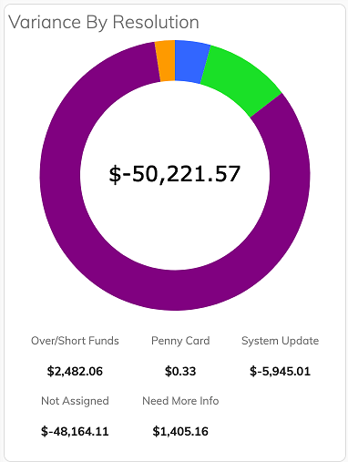 - Penny Card: This is the default category for any Subledger Reconciliation Item with a dollar amount between -$0.99 and $0.99. The number in the center of the doughnut represents the total dollar amount of all of the open cards on the kanban board. The breakdown of totals by resolution type is listed below.