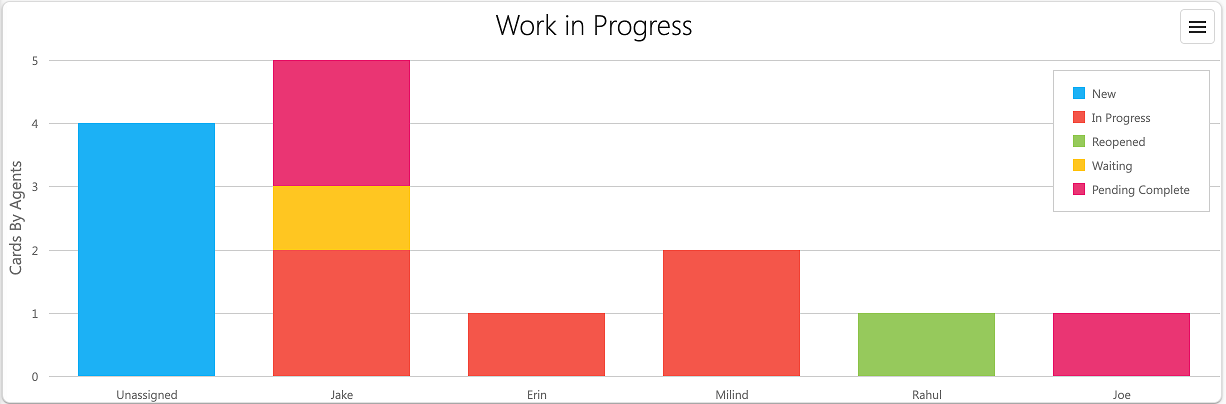 Work in Progress Work In Progress This dashboard element shows cards by agent and workflow step on the kanban board.