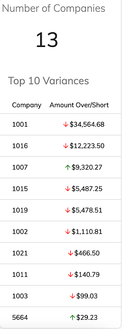 This dashboard element gives a summary of the top ten companies with overages or shortages, as defined by the Over/Short Funds resolution type on the kanban board.