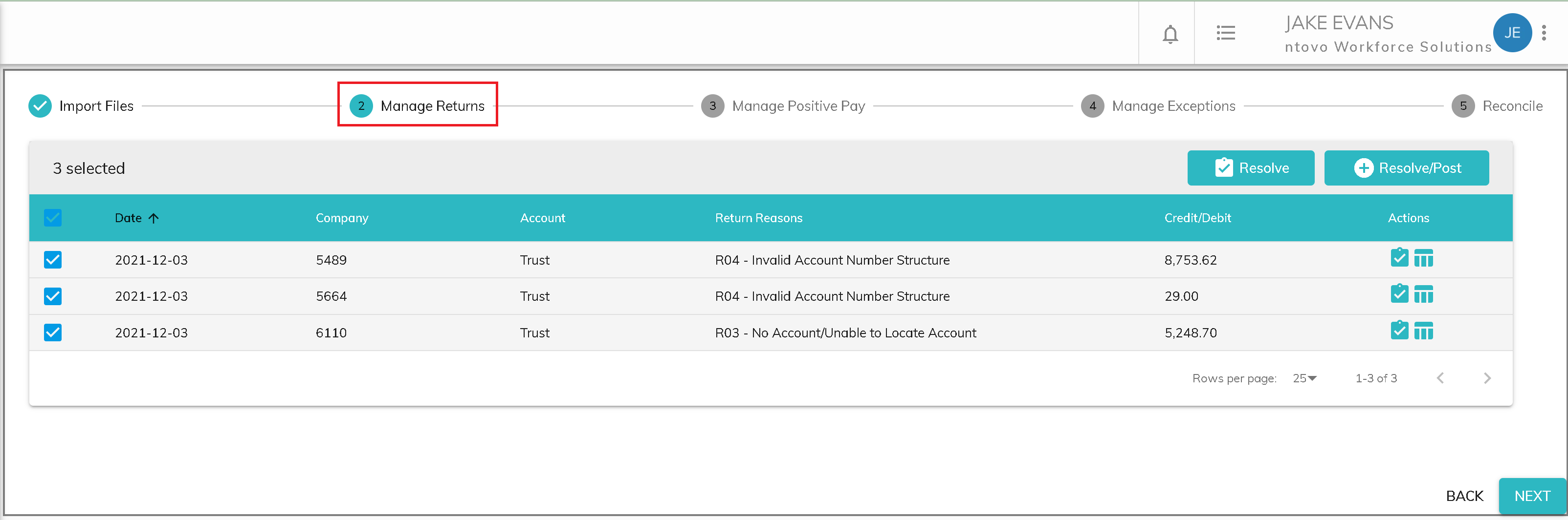If you subscribe to the ACH Returns module, you can use the Manage Returns screen to track and manage ACH Returns. Contact Support@RAKEdigital.com for more information. Once configured, Manage Returns will be a new step on your workflow.