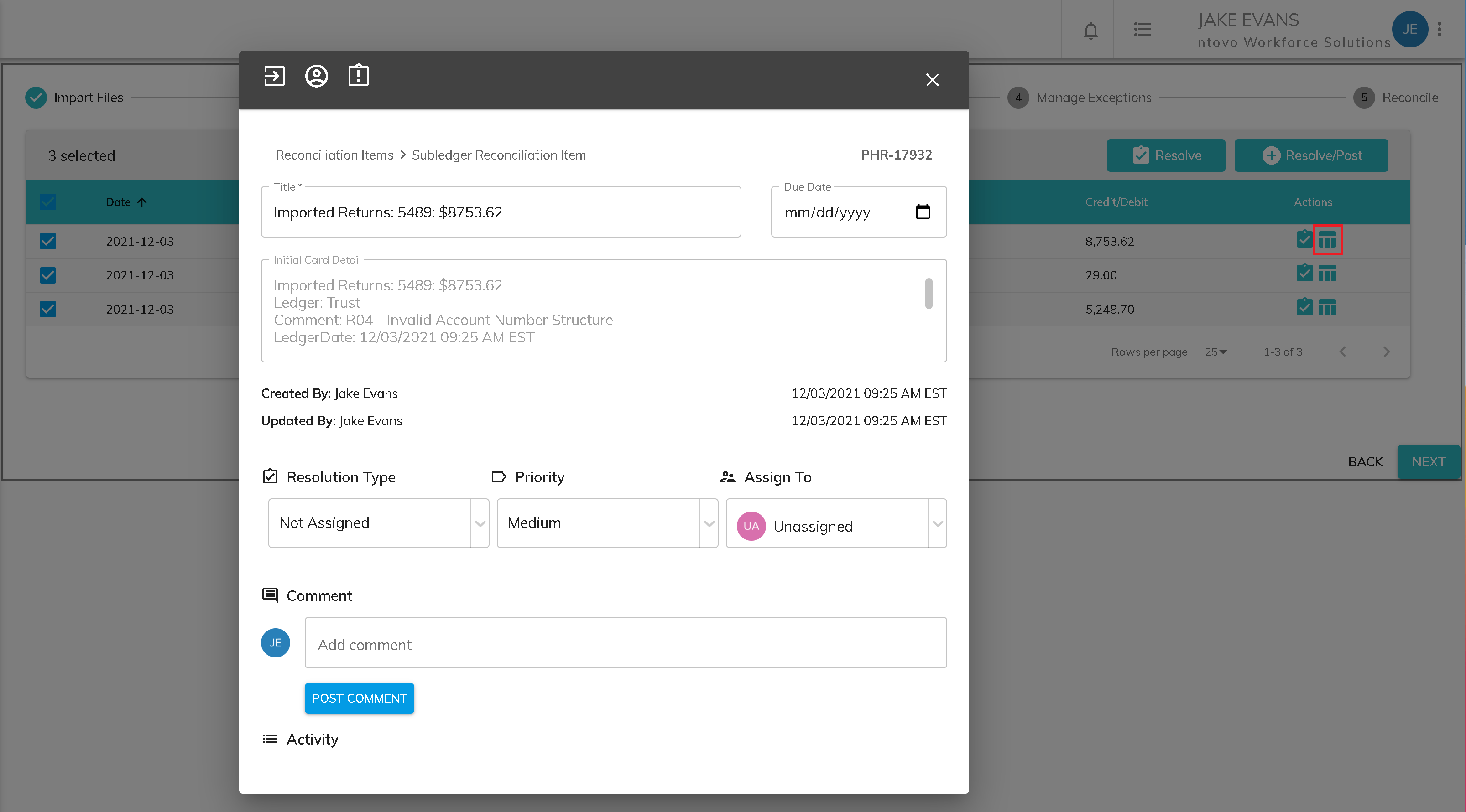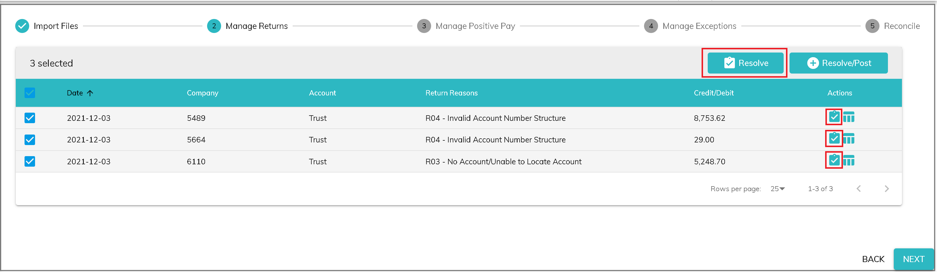 - Resolve/Post (individually or in bulk): Clicking the Resolve/Post button moves the card(s) to the completed column on the kanban board and posts reversing entries to the ledger to clear the resolution against. For example, you have a credit return in the amount of $8,753.62 that was imported as a returned item in a Returns file. When the Returns file is imported, the transaction is posted to the ledger and used to clear the return when it is posted by the bank. If you click Resolve/Post on that item, an additional entry will be posted to the ledger in the amount of -$8,753.62 and will be used to clear the refund of the return when it is posted by the bank. Only use this option if you will not also be importing the correction of the returned transaction in an ACH file. Select the transactions to be resolved and posted and click the Resolve/Post button in the header row.