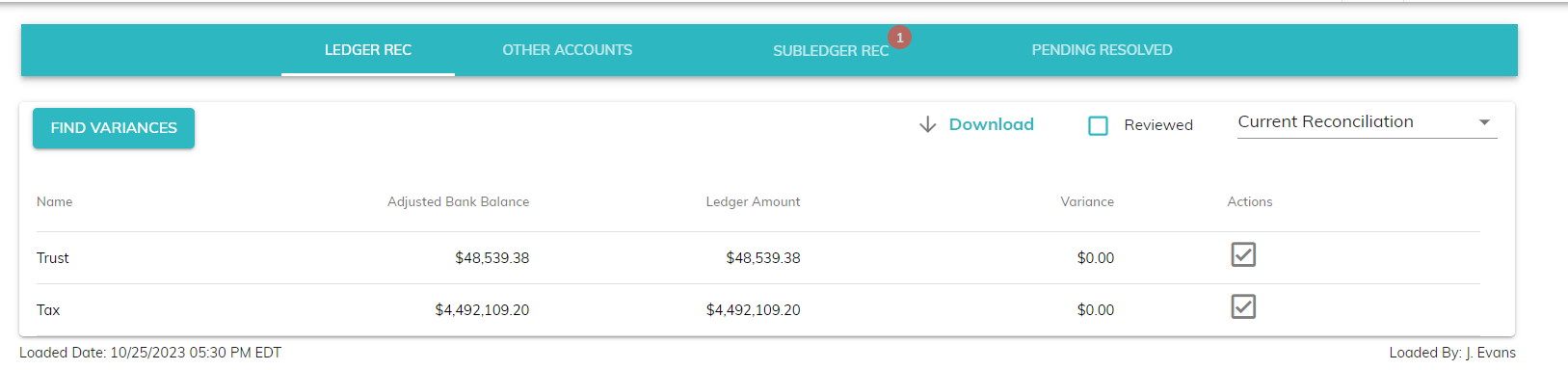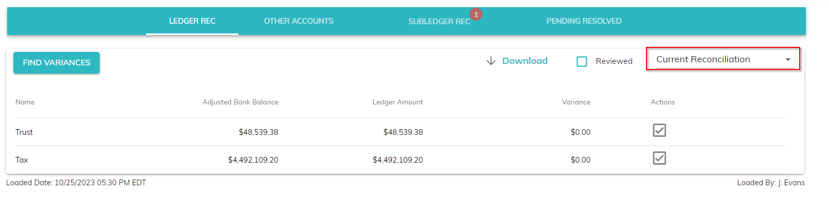 Navigate to the Workflow tab on your Navigation Bar. This will bring you to the Ledger Rec tab. Click "Find Variances" to update the ledger reconciliation tab with the most recent bank and ledger data.