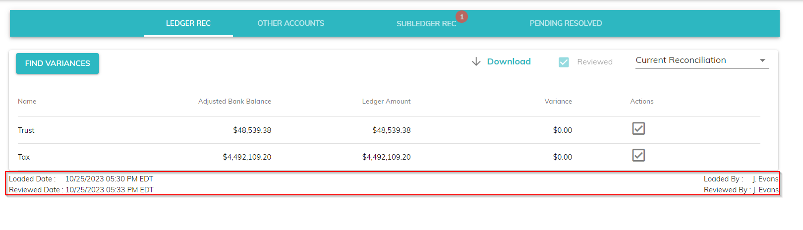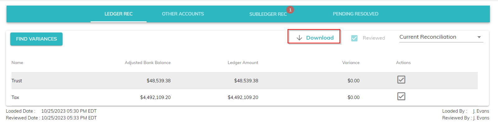 You can download the details of any ledger reconciliation performed after 10/26/2023 to a csv file by clicking on Download.