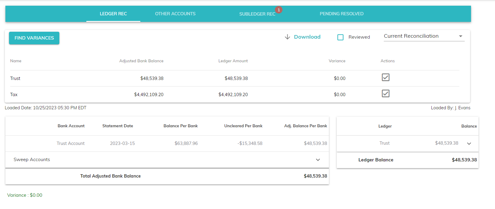 - Variance: The difference between the Adjusted Bank Balance and Ledger Amount