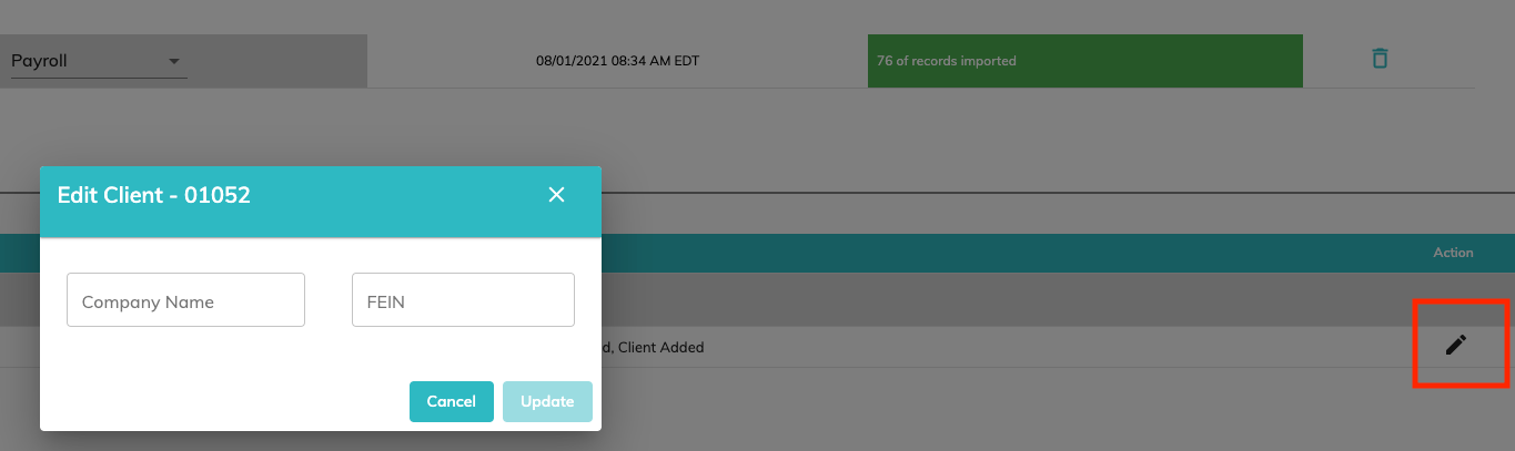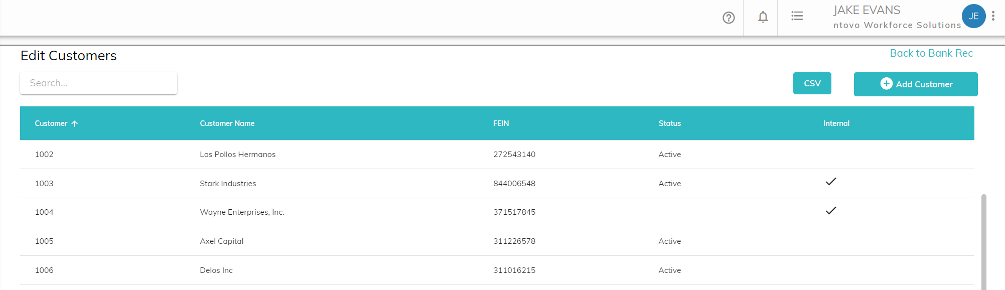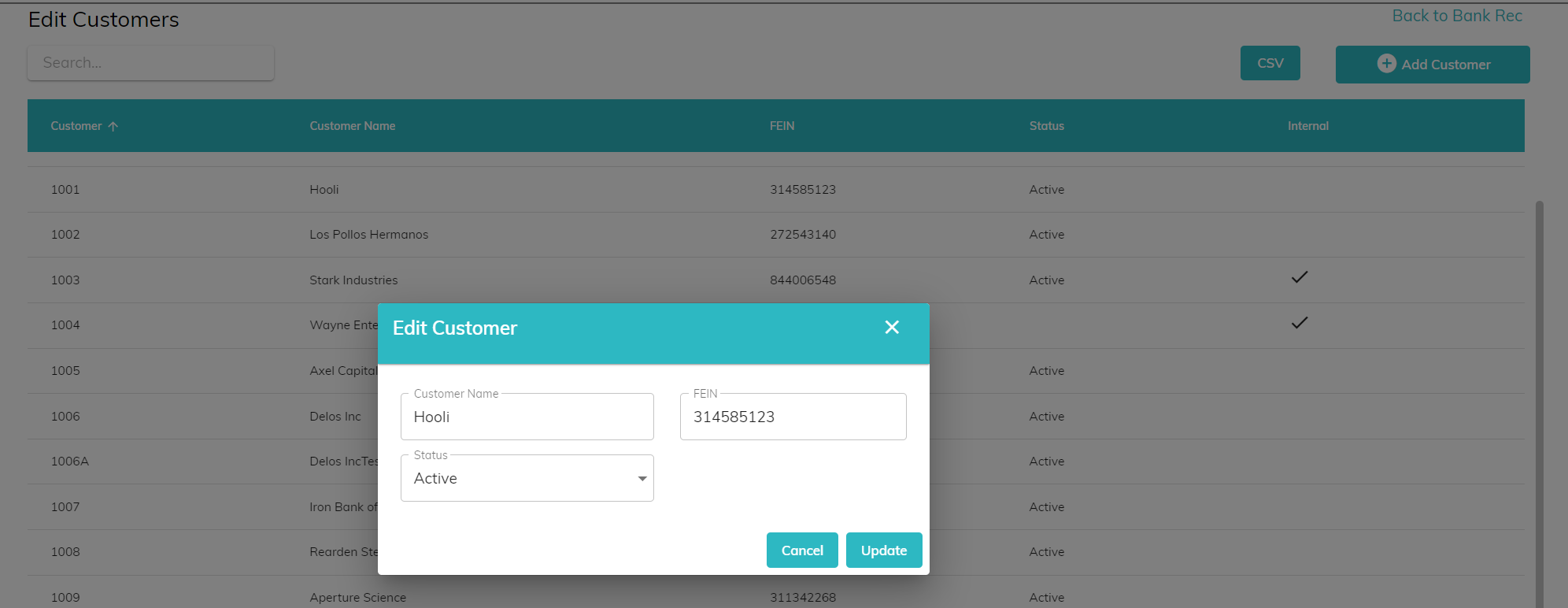 You can also update the name, FEIN, and status of existing customers by clicking on the row on the customer in the Customer list, modifying the information, and clicking Update.