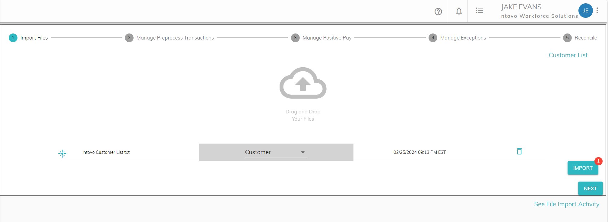 On the Import Files (Step 1) of the Bank Reconciliation workflow, you can either click to select the files or drag and drop your files into the window.