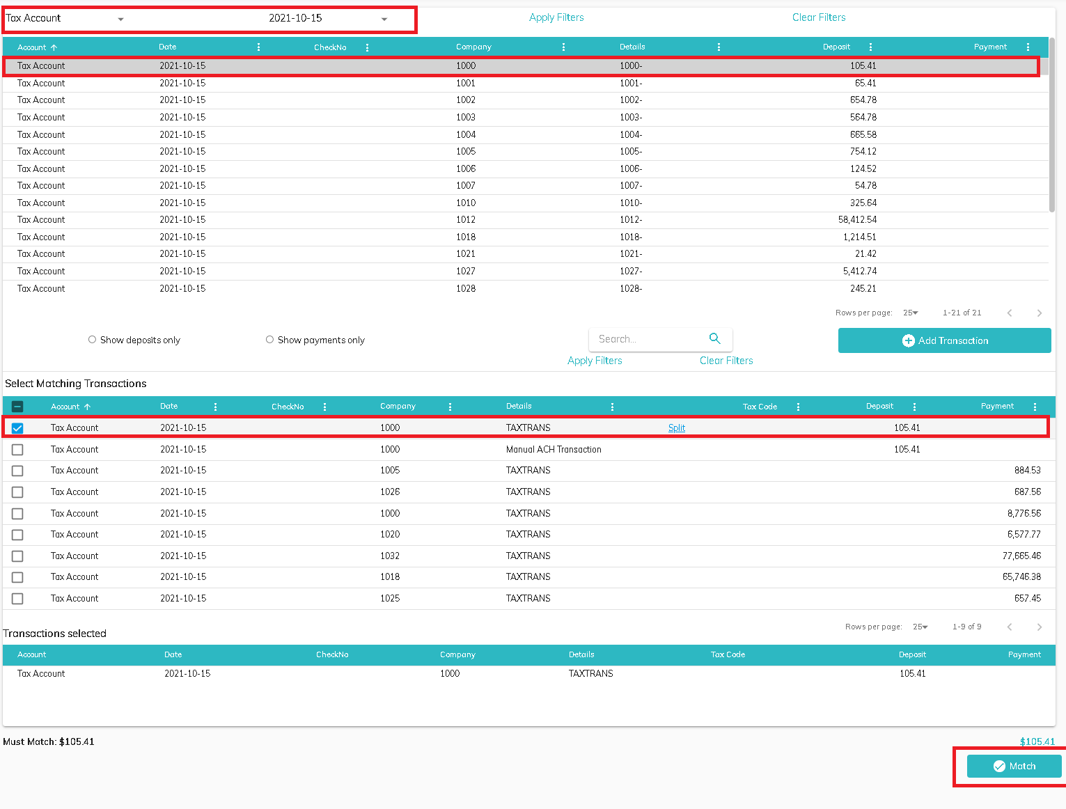 Choose the bank account and prior reconciliation from the Account and Statement Date fields. A list of all bank statement transactions will populate in the top section of the screen. Use the column header filters to navigate to the bank statement transaction that was cleared against the incorrect ledger transaction. Click in the row on the grid. The bottom section of the screen will populate with the ledger transaction(s) cleared against the bank transaction at the top of the list followed by all available uncleared ledger transactions. Uncheck the incorrect transaction(s) and select the correct transaction(s). When the amount of the ledger transaction(s) matches the amount of the bank transaction, the Match button will be enabled. Click Match to complete the re-match.