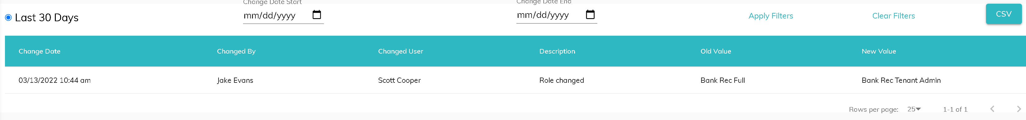 The Organization Report shows information about changes to users. By default, changes made within the prior 30 days are shown. The dates can be expanded by filling in the change start and change end dates and clicking Apply Filters.