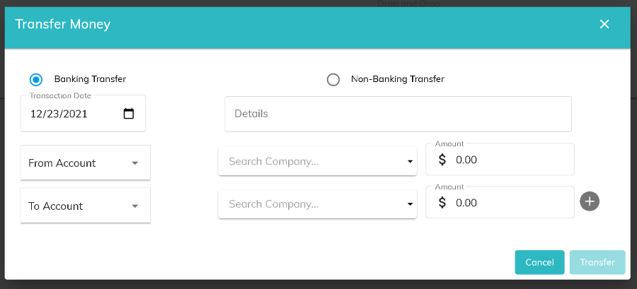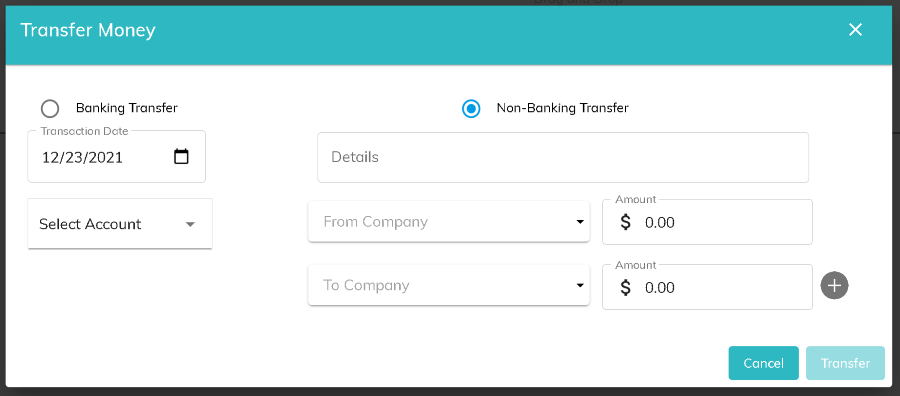 Click the Non-Banking Transfer radio button from the Transfer Money modal. Enter a transaction date, details, and bank account that will be applicable to all of the transactions in the transfer. Since funds will not actually be moved between bank accounts, there is only an option for one bank account.