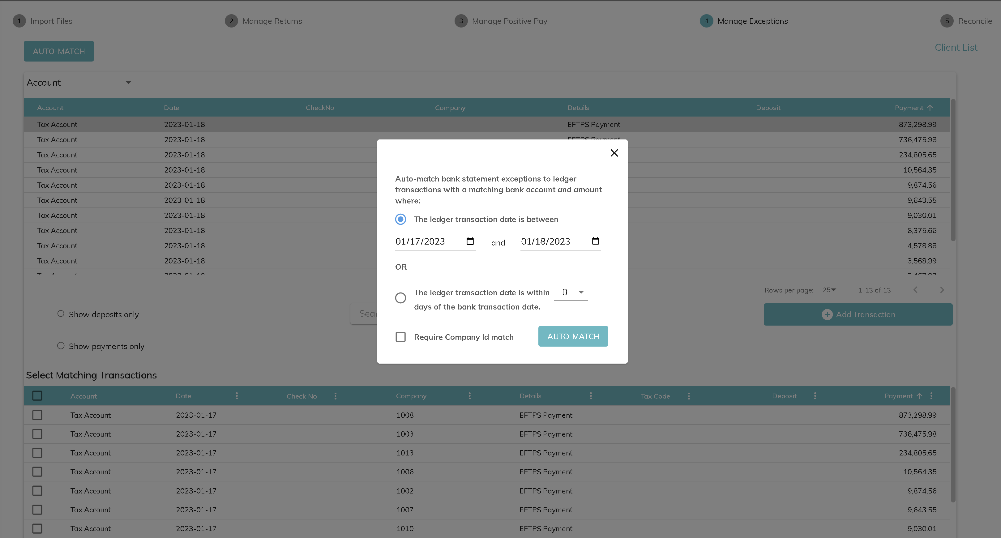 - For example, assume that there is an EFTPS batch file with a large number of tax payments that are expected to clear the bank of January 17th, 2023. The transactions actually clear the bank on January 18, 2023 and are included in a bank file that does not contain the company ID for the bank statement transactions. The EFTPS transactions will not auto-match when the bank file is imported because the company Id is not present in the bank file and the dates do not match. If the user would like to auto-match these transactions, click Auto-Match from the Manage Exceptions screen. Click either the first option and choose dates of January 17, 2023 through January 18, 2023. Or, click the second option and choose 1 day. Do not check the "Require Company Id match" check box. Click Auto-Match in the pop-up box and the transactions will match.